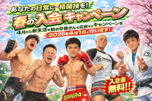 あなたの日常に格闘技を!4月から新生活を始める皆さんを応援するキャンペーンを2026年4月1日より行います。 グローブ、柔術衣は共に先着10名まで。無くなり次第、終了となります。ご入会をお考えの方はこの機会をお見逃しなく […]